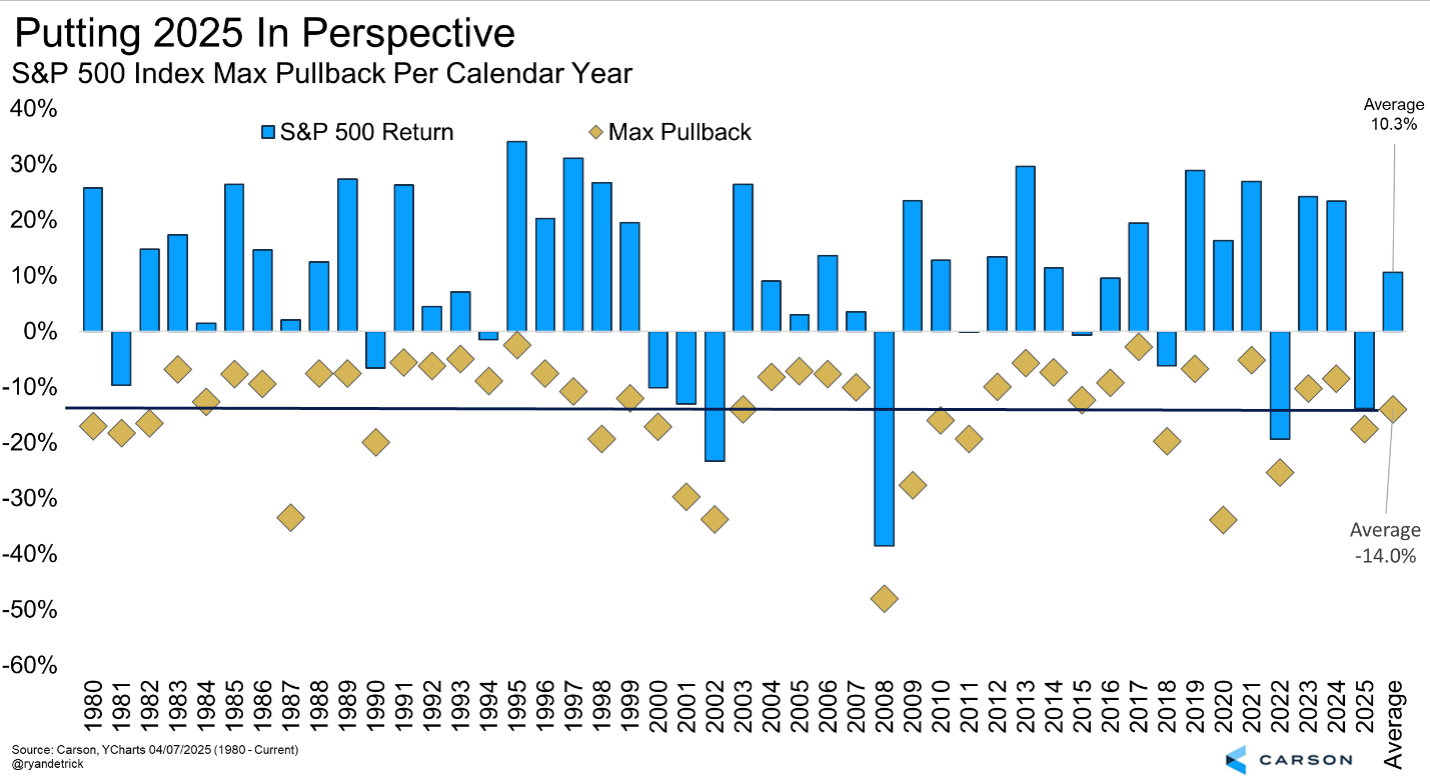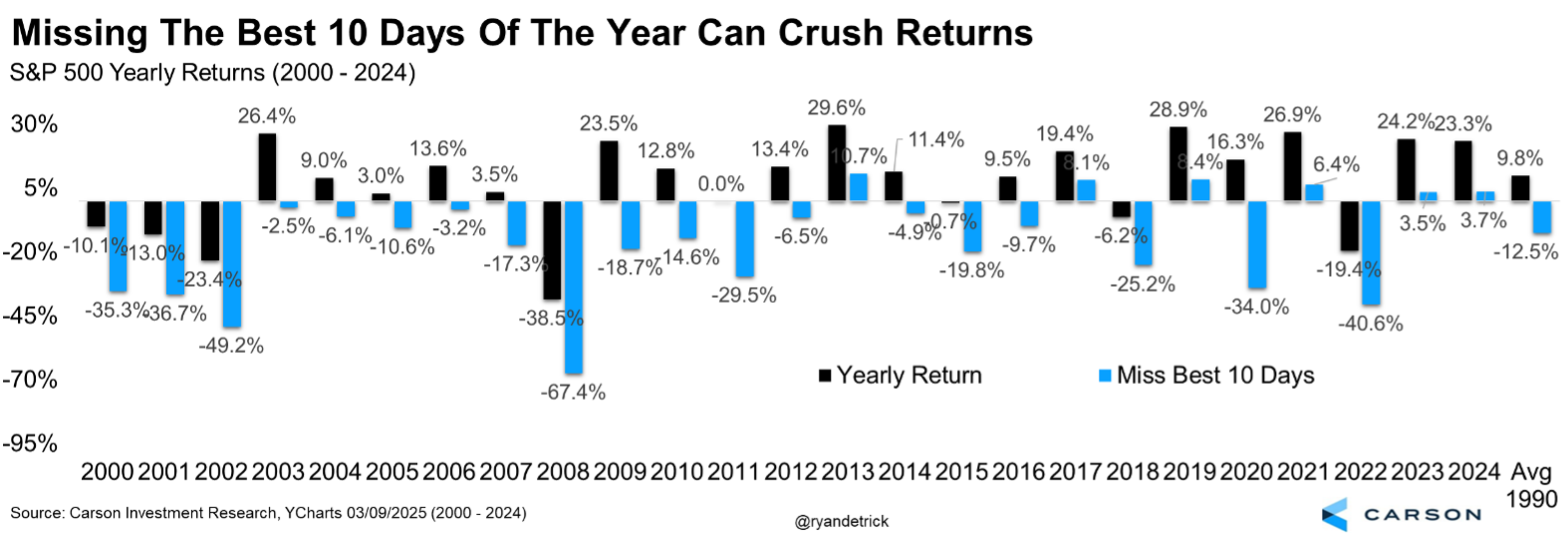 If you panic and sell at the lows, then you’ll miss out on the rebound. We’ve done the work, and we found that the worst days of the year happen right around the best days of the year. So if you can’t take the bad days we’ve seen lately and sell, you’ll inevitably miss the upcoming best days on the rebound, which is very difficult to time.