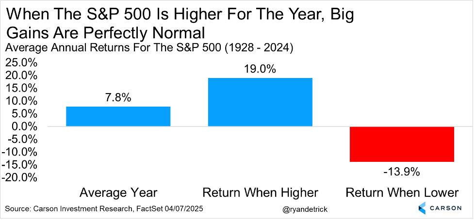 Looking at annual returns, when the S&P is positive, it is up 19.0% on average. When it is lower, it is down an average of nearly 14% for the year. Those are some big moves. Think about that again. When stocks finish higher on the year, they are up nearly 20% on average—likely way more than most investors expected. The flipside is when things are in the red, a decline of nearly 14% is perfectly normal. So larger down years might not happen as often, but they indeed can happen.