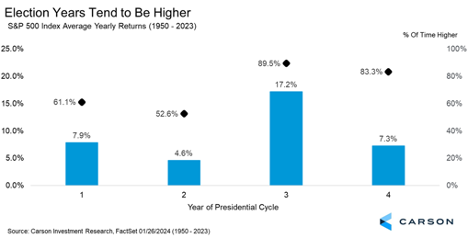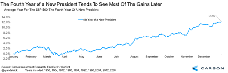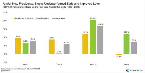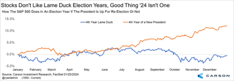 Historically, stocks have done much better in a pre-election year under a president in their first term (up more than 20% on average), while midterm years for a new president do much worse (virtually flat). That played out this time, with stocks down big in 2022 and bouncing back big in 2023. What matters now is election years, which have seen stocks do much better when a president is up for re-election versus a lame duck president.