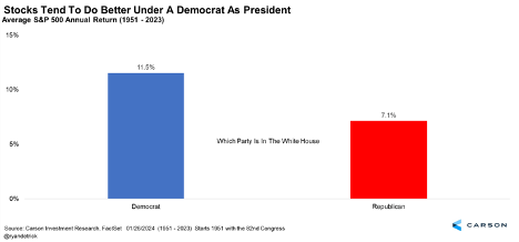 Another popular question is how stocks do based on which party is in the White House. Now is when people might want to throw something at me, but it is what it is. Historically, stocks have done better with a Democratic president versus a Republican in power. As with many of these numbers, we would take this with a grain of salt. Despite the tendency to view the president as responsible for the economy, the president alone often has a relatively small impact compared to broader economic forces. Do you think the fact that 10 of the last 11 recessions started under a Republican president is because a Republican was in the White House? We don’t.