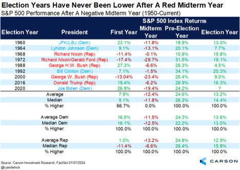 Another angle on this is after a 20% gain in a pre-election year, we’ve had a higher election year the past seven times going back to 1950. Also, look at how normal it is to have red in a midterm year, then a big bounce the following year. If this tendency continues to play out, it’ll be more good news for 2024.