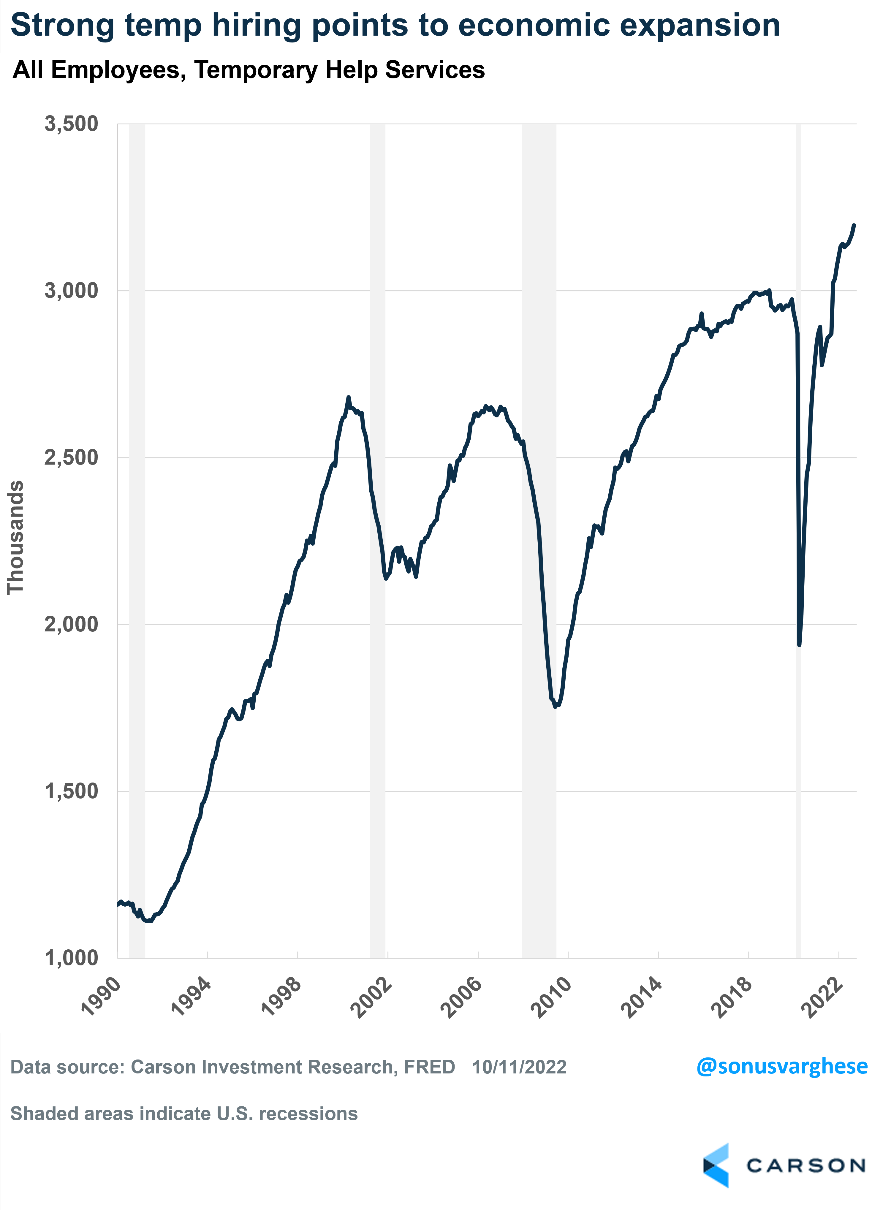When times are good and the economy is expanding, firms hire temps to ramp up quickly. And when times are bad, firms can scale down by letting temps go first, without laying off more experienced workers. We’ve seen temp employment fall prior to the start of the last four recessions. The current situation is very different, as temp help services employment has continued to rise, which is historically not something you would see if we were close to a recession.