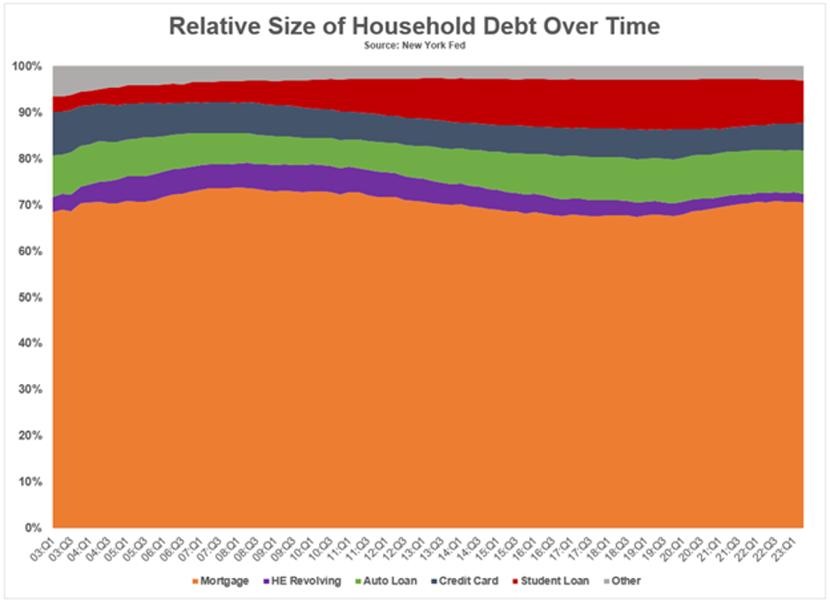 We hear a lot about how credit card debt cracked $1 trillion for the first time ever and the only reason the economy is growing is because people are buying everything on credit cards. The truth is equity and net wealth have also increased, so it makes sense people have more debt. Also, credit card debt as a percent of overall debt has remained steady over time.