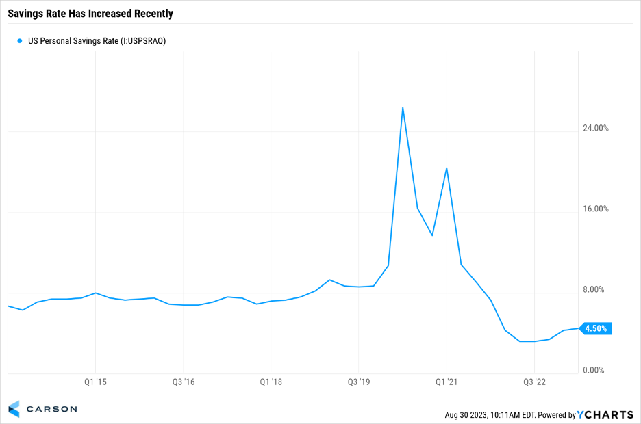 Lastly, the savings rate has increased over the past year, from a low of 3.2% last summer, up to 4.5% right now. Again, without getting too into the weeds here, savings have actually been increasing over the past year, something that you’d never know if all you looked at was excess savings.