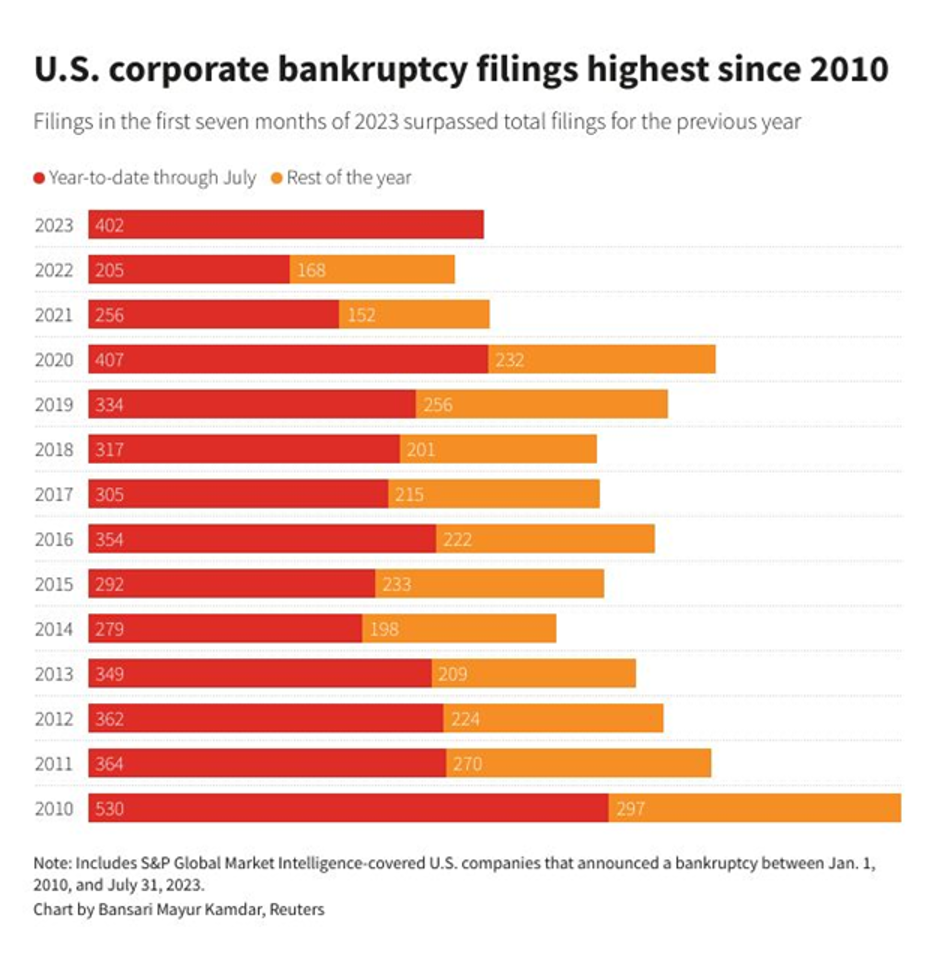 Through July, there had been 402 U.S. corporate bankruptcies, compared with only 205 last year. In fact, it was the highest since 2010, which saw 530 in the first seven months.