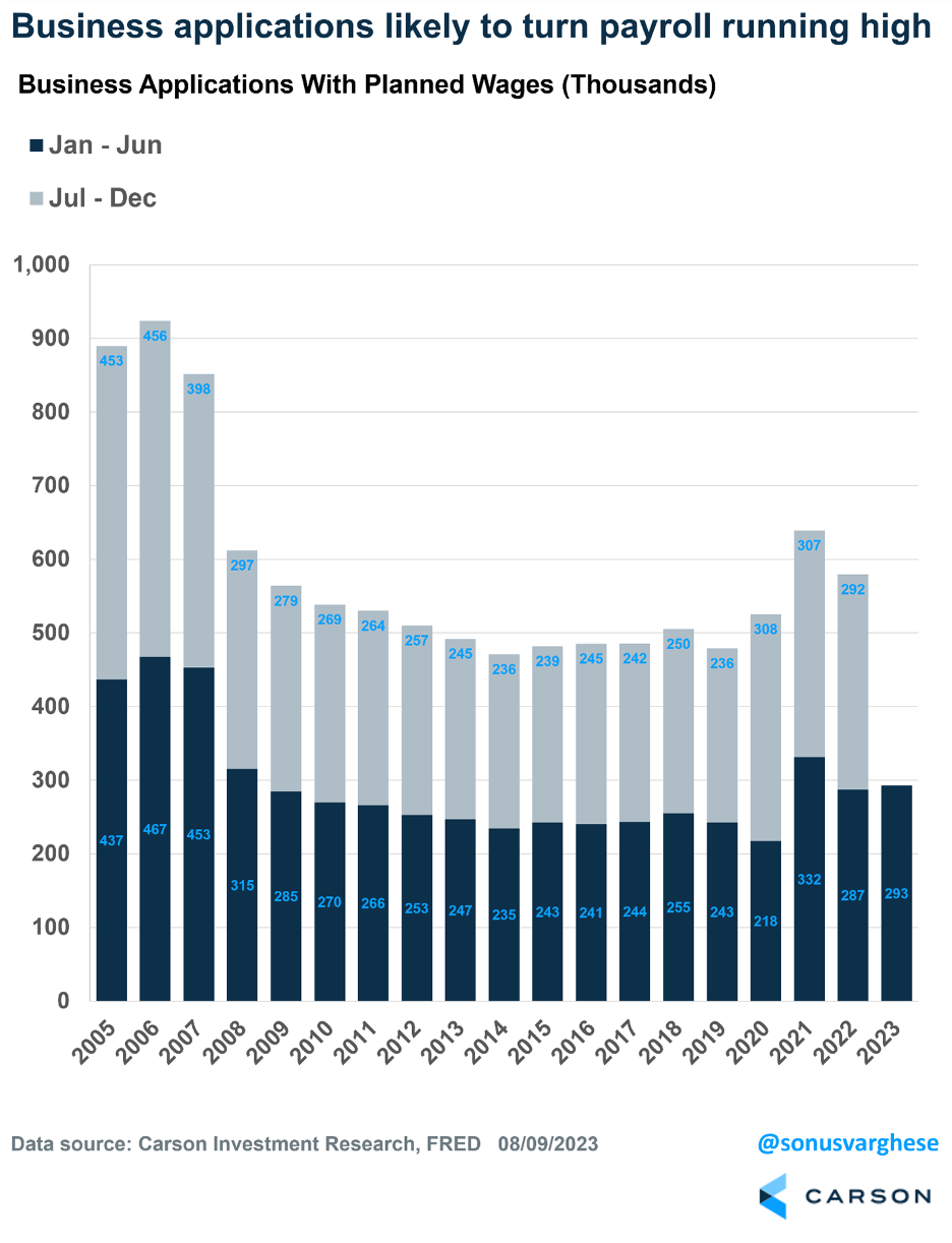 Also, the other side to bankruptcies is entrepreneurship, or creation of new businesses and companies. That’s right, we’ve seen a solid number of monthly business applications the first six months of the year, to the tune of 293,000 business applications with planned wages. This was 21% higher than 2019, for instance, and much higher than any other time during the last decade.