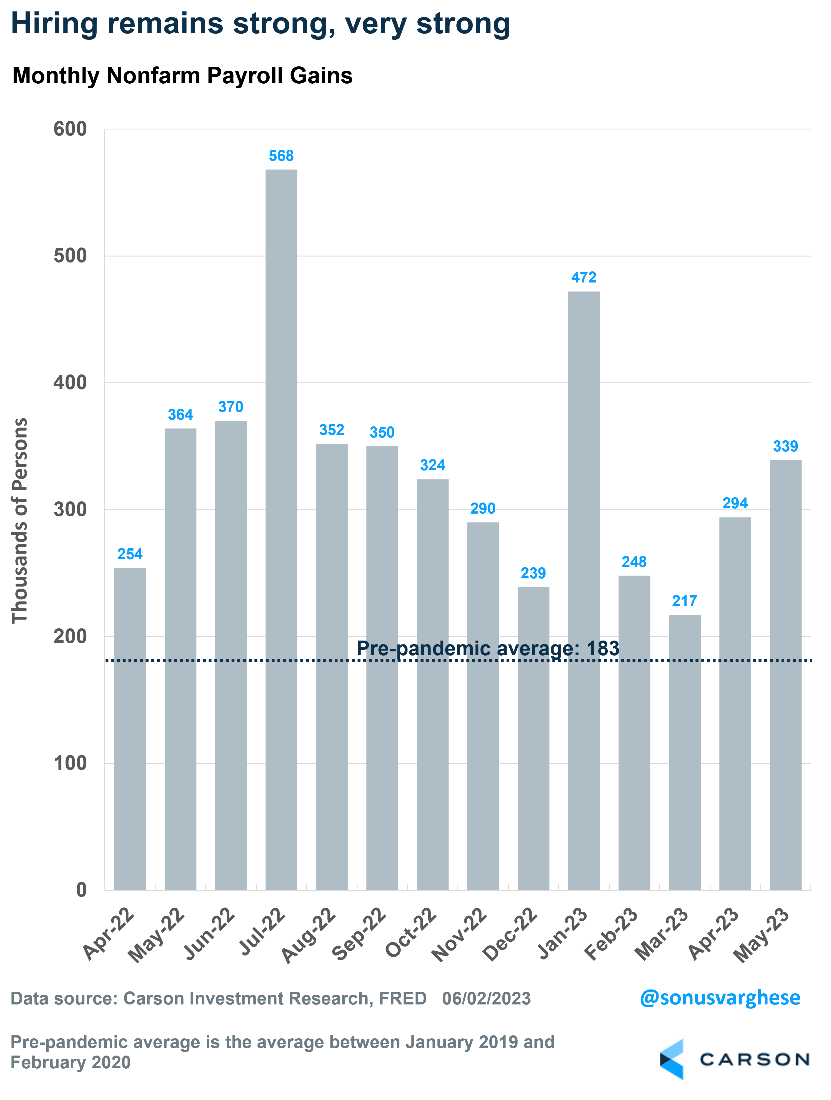 • The economy created 339,000 jobs in May, beating expectations for the 14th consecutive month.