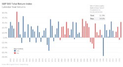 Based on data beginning in 1949, during periods when Republicans controlled at least two of the presidency, the Senate or the House of Representatives, the S&P 500 rose 14.8% per year. When Democrats held at least two, the S&P 500 rose 11.8% per year. When one party controlled all three branches, the average return was 15.0% while divided government averaged 11.5%. Both Democratic and Republican one-party control outperformed divided government, and Democratic presidents averaged a higher rate of return than Republican presidents.