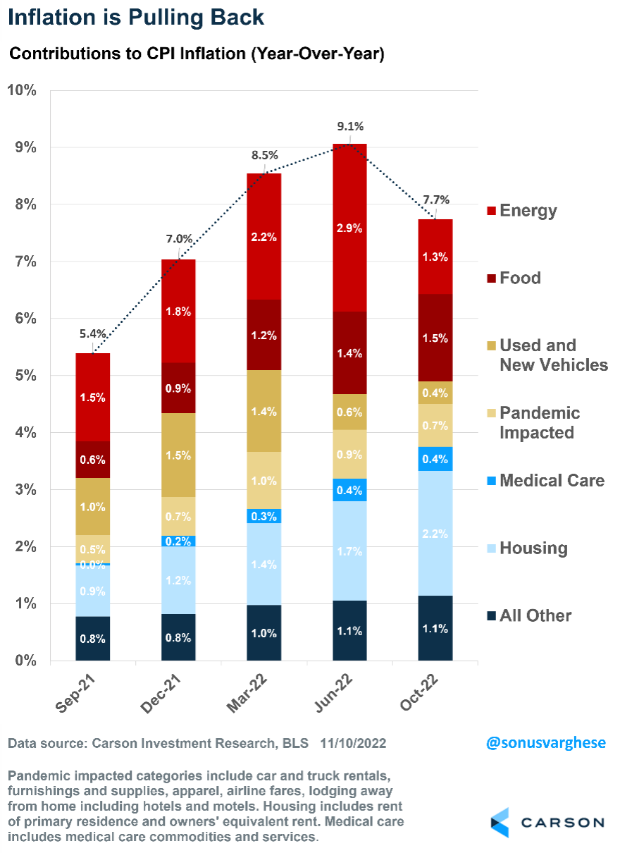 On the heels of a huge month for stocks in October, the bull continued to soar in November, as the S&P 500 had its best week since June and the NASDAQ had its best week since March. Sparking much of the rally was news that inflation has likely peaked and is finally slowing. We’ll discuss that more below, but the bottom line is this could be a major catalyst for a continuation of the rally. We noted recently that many bear markets have ended in October, and we continue to think the odds are above average that it happened once again.