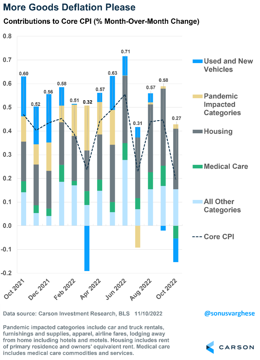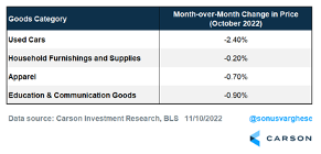 Private inflation data has shown decelerating prices for goods outside of energy and food. At Carson, our chief market strategist, Ryan Detrick, wrote recently about collapsing used car prices. Retailers have been telling us for a while that they’re discounting items as well. We’ve just been waiting for the official inflation data to catch up, and it looks like that’s finally happening.