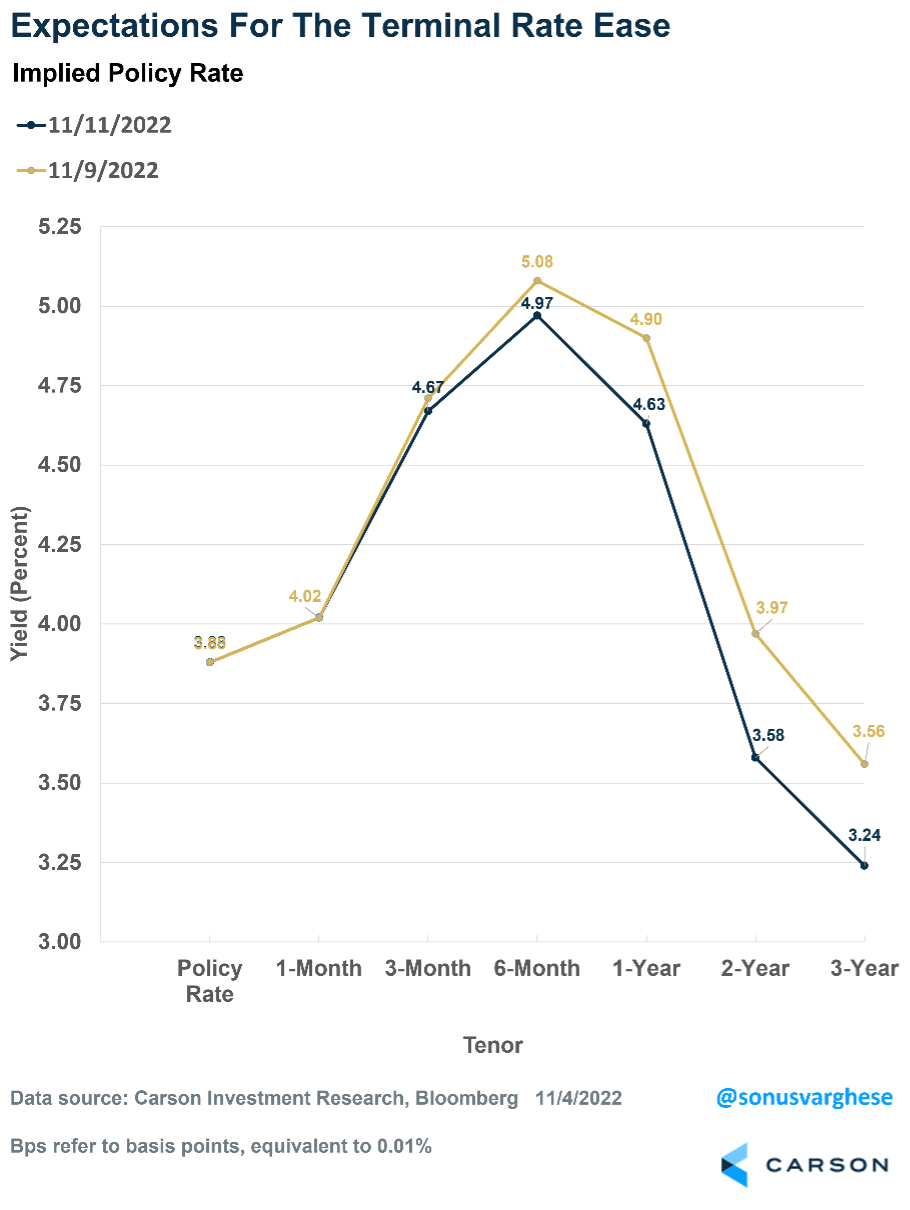 An interesting point Fed Chair Jerome Powell made a couple of weeks ago was that improved inflation data is not a precondition for slowing the pace of rate hikes. Instead, it’s the terminal rate that matters. The terminal rate is the highest rate the Fed will hike up to this cycle, and at the September meeting, Fed members released projections estimating it to be around 4.6%. Markets have expected this number to move close to 5% when the Fed releases new projections at its December meeting. If the October inflation numbers had come in hot, there would have been a lot of pressure on Fed officials to take the terminal rate projection well above 5%. But this report eases that pressure, and investors are currently looking at a terminal rate just shy of 5%.