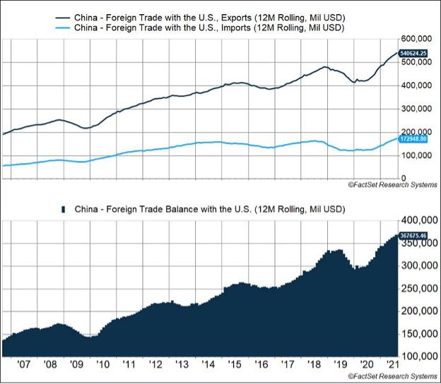 China has been listed as a top five risk in our quarterly market outlook for most of the last three years. The relationship between the U.S. and China has become more competitive and tense in recent years, primarily because of a lingering trade imbalance. As Figure 1 shows, the trade deficit between the U.S and China continues to widen. U.S economic stimulus efforts have likely contributed by encouraging U.S. consumers to purchase more goods during the pandemic. Invariably, some of those goods were manufactured in China.