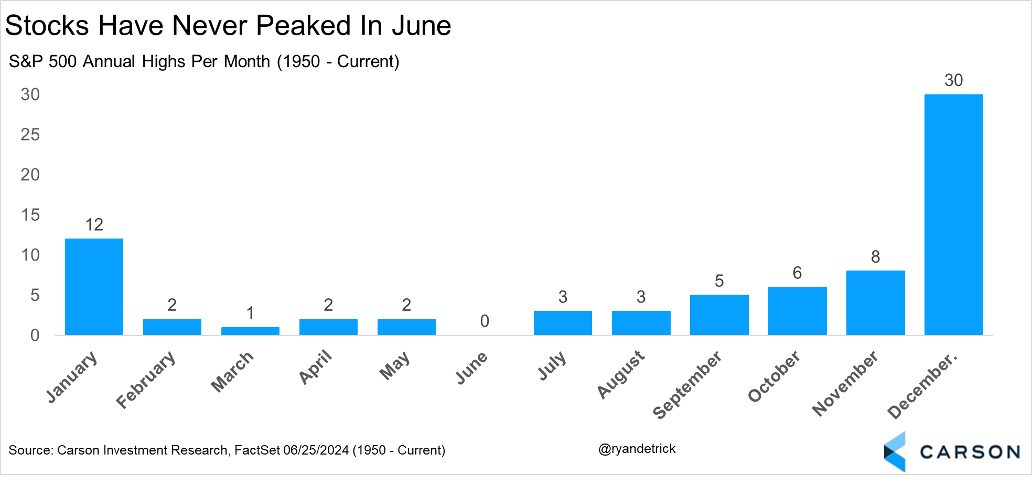 Something else to consider is stocks rarely peak for the year in June. In fact, since 1950 it has never happened. We won’t pretend to know why this is, but we won’t argue with it and this is another nice feather in the cap for the bulls. (In fact, this has already held true for 2024, since the S&P 500 has already made a new all-time high in July.)
