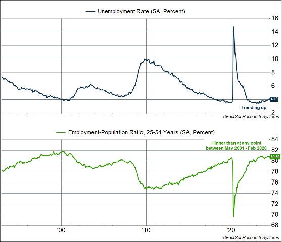 Rather than the unemployment rate, we prefer looking at the “prime-age” (25-54 years) employment-population ratio, since it gets around definitional issues that crop up with the unemployment rate (someone is counted as being “unemployed” only if they’re “actively looking for a job”) or demographics (an aging population has more people retiring and leaving the labor force every day). The prime-age employment population ratio was unchanged at 80.8% in May. That’s only slightly below the high from last summer, and above anything we saw between 2001 and 2019 (when it peaked at 80.4%). This by itself should tell you the labor market is strong, with more people participating in it.