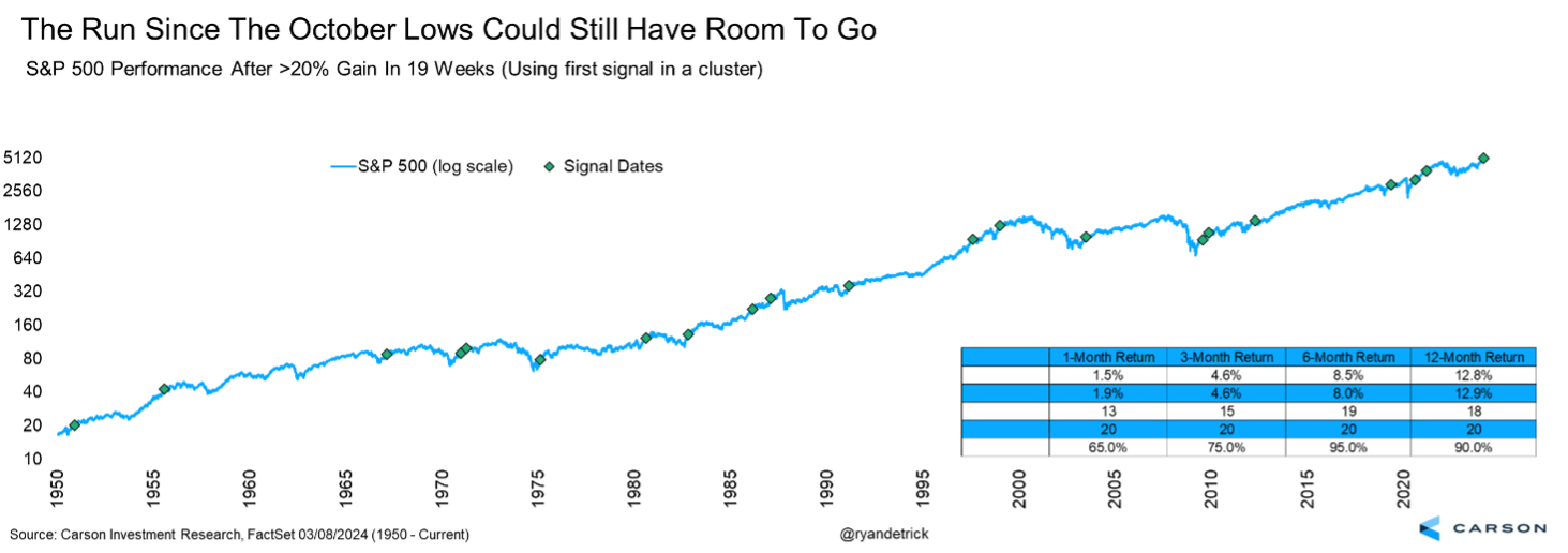 We sound like a broken record, but that could be a good thing in a bull market, as stocks made more new highs last week. In the end, the S&P 500 closed marginally lower for the week after a late Friday afternoon sell-off. But stocks have been up 16 out of the last 19 weeks, rising more than 24% during that rally. In the history of the S&P 500, stocks have never risen that quickly with such consistent weekly gains.