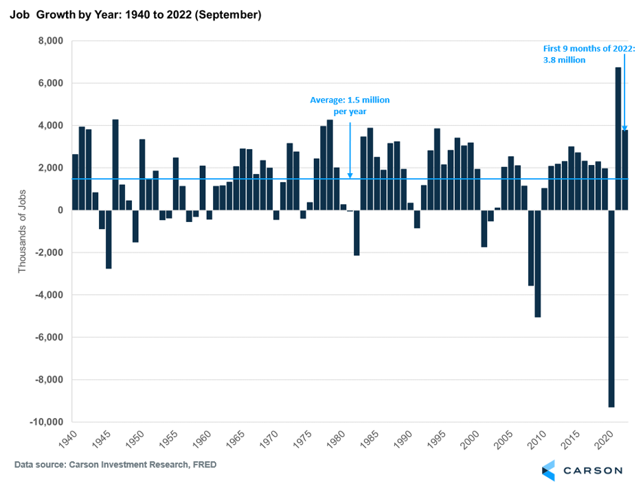 There’s been no end to bad news and negativity this year, but employment has been a lone bright spot. True to this year’s form, the September payroll report continued to show strength and resiliency. The economy created 263,000 jobs in September, which was slightly higher than expected. Over the past three months, the economy has created more than 1.1 million jobs. Entire years rarely see that amount of job creation, let alone three months. All in all, 2022 has been a massive year for the labor market, with payrolls growing by 3.8 million over the first nine months, putting it ninth on the list for annual job creation since 1940. And the year is not done yet.