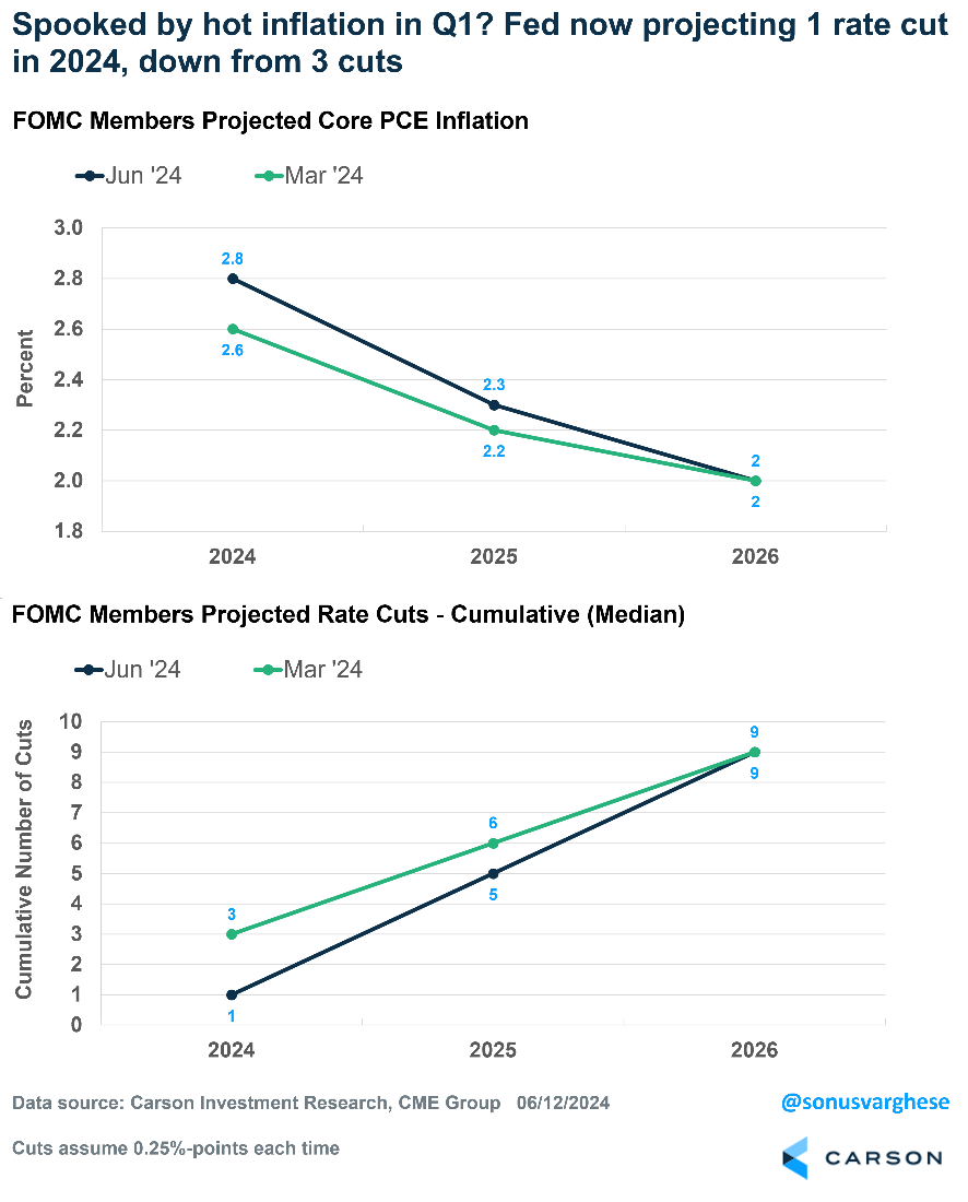 Despite having early access to the May inflation data, we believe they were clearly spooked by the hotter-than-expected inflation data in Q1. They raised their 2024 projection for core inflation from 2.6% to 2.8%. (They use the Personal Consumption Expenditure Index, or PCE, which runs a little softer than CPI.) It doesn’t seem like a big shift, except they now project just 1 rate cut (worth 0.25%-points) in 2024, versus the 3 projected in March. The Fed was on the wrong side of the whole “transitory inflation” call a couple of years ago, and they clearly don’t want to be caught offside again. Once bitten, twice shy.