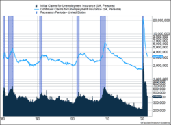 A longer-term evaluation, as shown in Figure 1, suggests current trends may be more normal. Figure 1 uses an adapted scale, where big increases don’t look so large and it is easier to spot differences in other periods. The data show periods of economic strength can include times when initial unemployment claims are high. The Reagan recovery during the mid-80s and again in the mid-90s both had periods when initial unemployment claims were high even though the economy wasn’t in recession.