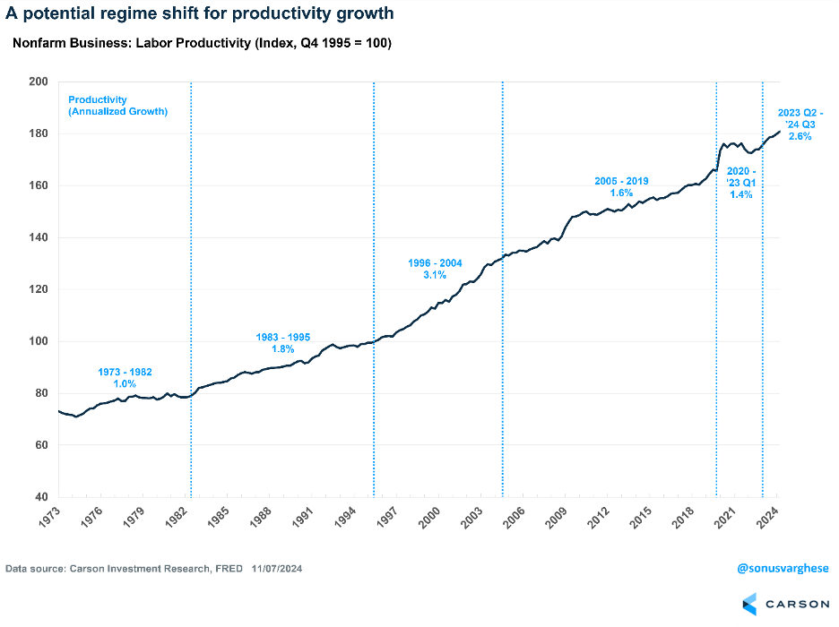 The reality is some of the best years for the economy and stock market have been during periods of strong productivity, which makes sense since productivity growth is a key input to GDP. Last year for instance saw nominal Gross Domestic Product (GDP) up nearly 6% and we are now looking at back-to-back 20% years for the S&P 500, something we don’t think is a coincidence with productivity strong. The last time we saw an extended period of strong productivity? The mid to late1990s, one of the best periods ever for investors.