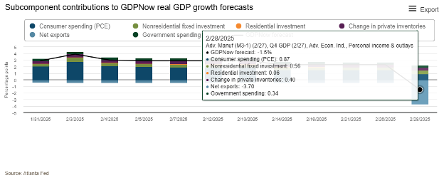 Even as the world’s attention last Friday was focused elsewhere, we got a real doozy of a data update in a corner of the economic universe that usually doesn’t get much play. The Atlanta Federal Reserve’s Real GDP “Nowcast” for Q1 plunged from 2.3% to -1.5%. Yeah, that’s not a typo, nor is it a computation error by the folks who run what is normally a very good, and popular, GDP growth tracker (typically even better than economists’ consensus forecast, which right now is close to 2% for Q1). The GDP Nowcast is a running estimate of the GDP growth in the current quarter and is continually updated as data are released. However, as this latest batch of data just showed, the nowcast has a big flaw, which gets to why the GDP growth tracker collapsed. In short, you shouldn’t panic, though that doesn’t mean there are no concerns.