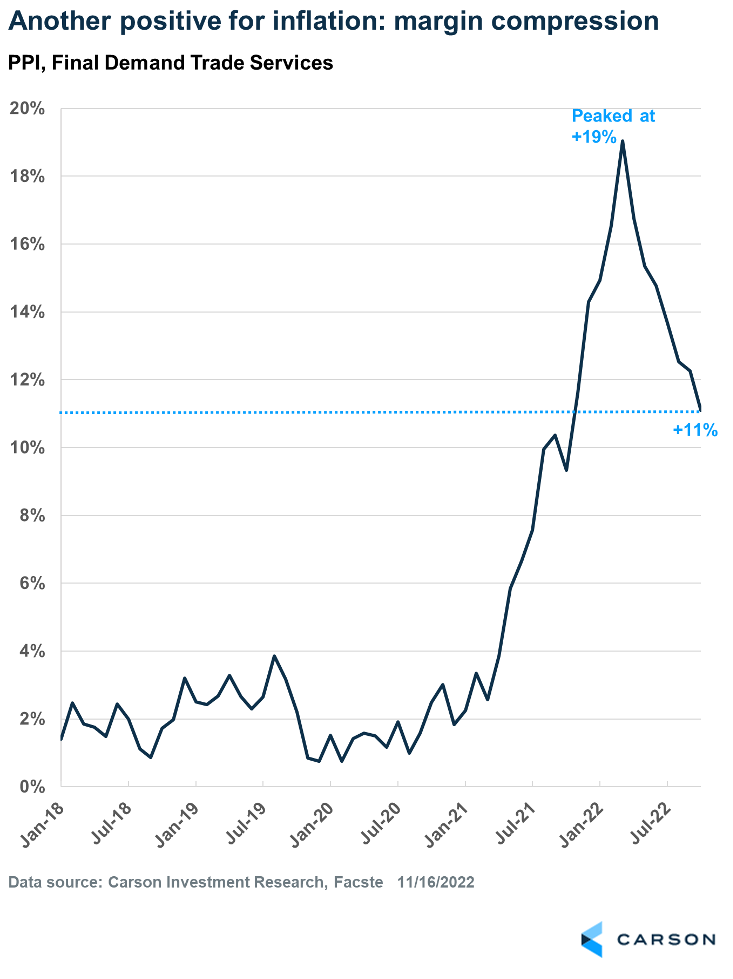 Last week also produced good news from inflation at the producer level. That’s positive for consumers, because if it costs less to produce goods, companies can sell them for lower prices. In fact, the Producer Price Index (PPI) in October fell 0.5% after falling significantly the last few months. The year-over-year pace is now about 11%, having decelerated from a peak of 19% in March 2022. It still has further to go to return to the pre-pandemic pace of about 2%, but the trend is very encouraging.