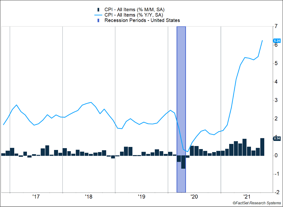 An inflation surprise created a challenge for investors. The Consumer Price Index rose 0.9% last month. The monthly increase was the largest reached in 2021, and the yearly increase of 6.2% was the largest since 1990, when the Gulf War contributed to a surge in oil prices (Figure 1).
