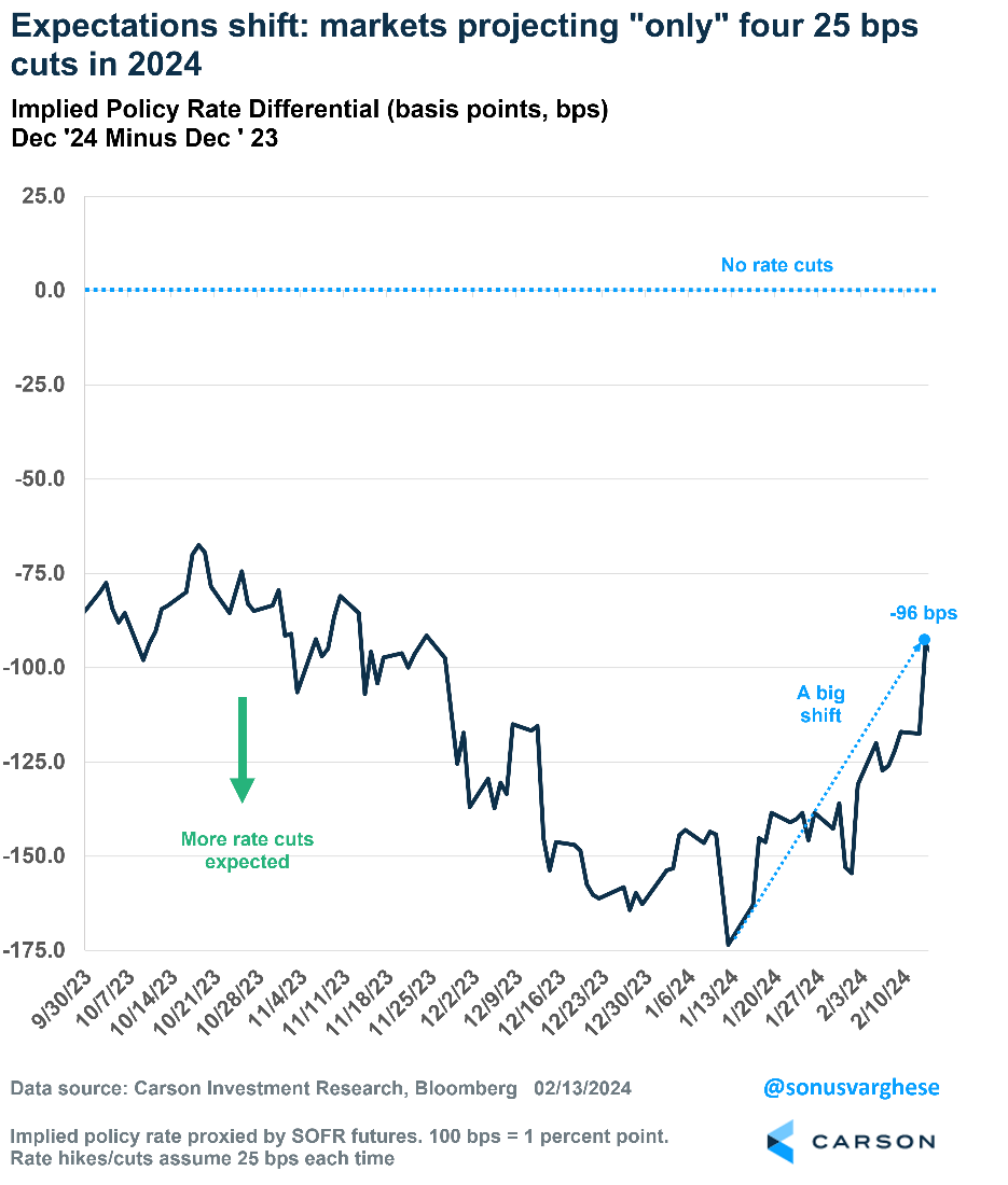Ouch! That was our reaction to the hotter-than-expected January Consumer Price Index (CPI) report, although that was mild compared to what happened in markets. The S&P 500 fell 1.4% last Tuesday. Bond prices fell as well, with two-year and 10-year Treasury yields jumping 0.14% to 4.63% and 4.31%, respectively. This was on the back of a big shift in the narrative around Federal Reserve rate-cut expectations. The timing of the first cut has been pushed out to June and investors are pricing in about four rate cuts in all of 2024, equivalent to 1%. A month ago, investors believed the first cut would happen in March and the Fed could cut six or seven times in 2024. That’s a big shift in a relatively short period of time, and the January CPI data underlined the move.
