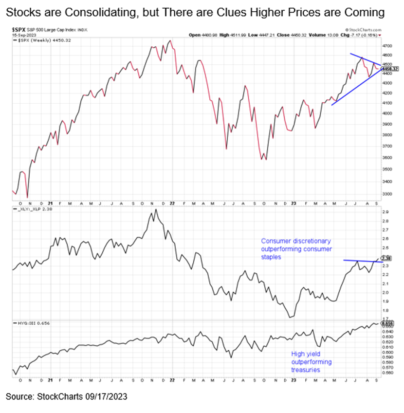 What are some clues that better times could be coming soon? Sentiment is quite pessimistic, which could be a sign that the influx of bulls during the summer is slowing. This is encouraging, as the market needs to shake them out. Also, consumer discretionary stocks are outperforming consumer staples. This is another clue the overall market will likely go higher — it’s a positive sign when the aggressive areas of the market lead the defensive ones. Lastly, high yield is outperforming Treasuries, another sign aggressive areas are doing better than defensive. If a monster was under the bed, we’d expect to see high yield doing much worse, but that hasn’t been the case.