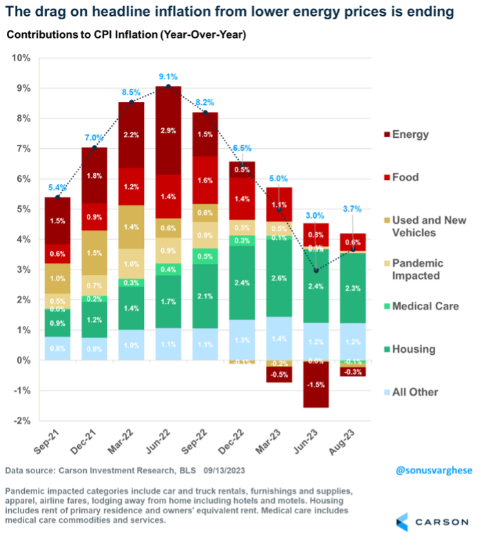 Inflation, as measured by the Consumer Price Index (CPI), rose 0.6% in August, bringing its year-over-year pace to 3.7%. As the chart below shows, the primary driver of disinflation over the past year, from a peak of 9% in June 2022 to 3% in June 2023, was falling energy prices. But that reversed in August, with gas prices rising 10.6%.