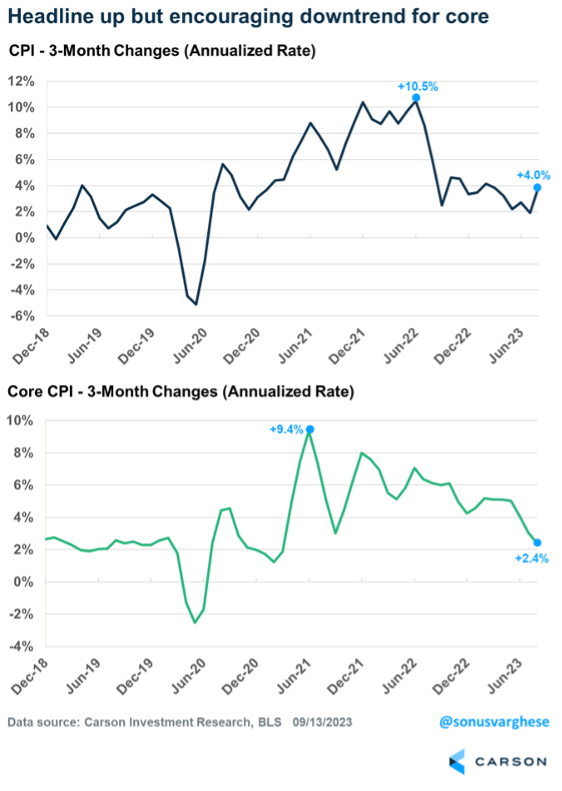 For inflation to continue to fall, categories outside energy need to ease. Encouragingly, signs indicate this downward trend is still in place. Headline inflation was up at an annualized pace of 4% over the past three months, but core inflation, which excludes food and energy, is running at 2.4%. That’s the slowest pace since March 2021.