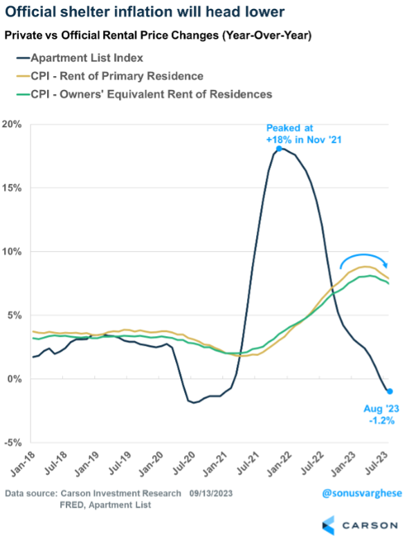 Housing makes up 40% of core inflation, and the August numbers showed the official data is catching up to private rental data, albeit slowly. Housing inflation ran at an annualized pace of 8-10% between June 2022 and February 2023. That slowed to a 5.5-7% annual pace between March and July, and it fell further in August, to 5%. This is still high and is keeping core inflation elevated. However, housing data is likely to continue its downtrend in the months ahead, putting further downward pressure on core inflation. Market-based rental indices from Apartment List show rents are now down 1% over the past year.