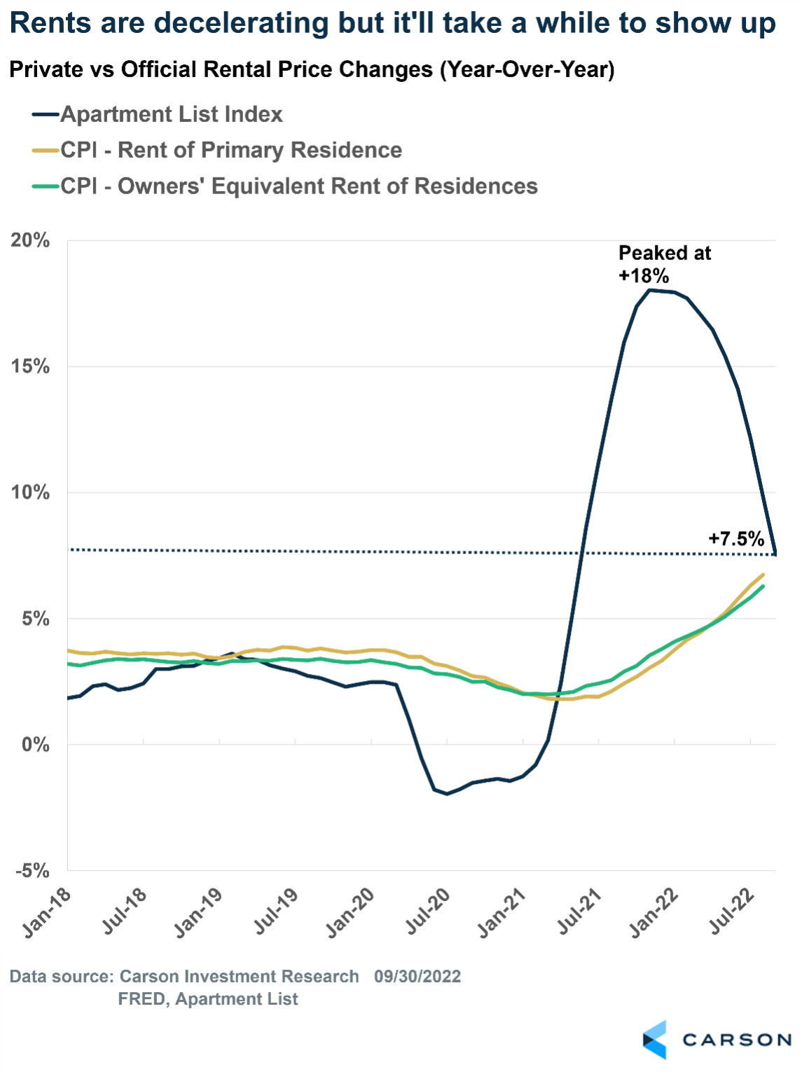 A big part of core inflation is housing, which is categorized as “rents” because official inflation numbers assume homeowners rent their homes to themselves as a service, and these rents are obtained from equivalent homes (called “Owner’s Equivalent Rents”). The good news is private measures of rents are showing a rapid deceleration in prices. The latest Apartment List national rent report showed rent growth is considerably slower than last year. Its rental index is up 7.5% year-over-year as of September, which is well below the peak 18% from last November.