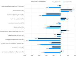 Figure 1 also provides a better understanding of what parts of the economy are bouncing back most rapidly. Core retail sales, which exclude food service, autos, and gasoline, didn’t rise nearly as much. As can be seen in Figure 2, sales at gasoline stations, motor vehicle retailers, and restaurants all snapped back but remain well below year-ago levels.