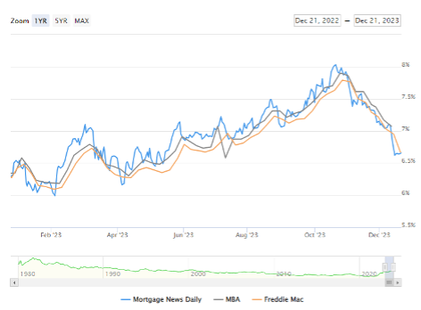 Third, 30-year fixed mortgage rates have fallen from 8% to almost 6.5%. Thanks to markets pricing in interest-rate cuts by the Federal Reserve next year, mortgage rates have fallen sharply. While 6.5% is higher than the mortgage rate most homeowners pay, which is 3-4%, there’s a massive cohort of 25-34-year-olds who want homes but are being priced out, assuming they can even find a home to buy. Lower mortgage rates boost perceptions of home affordability.