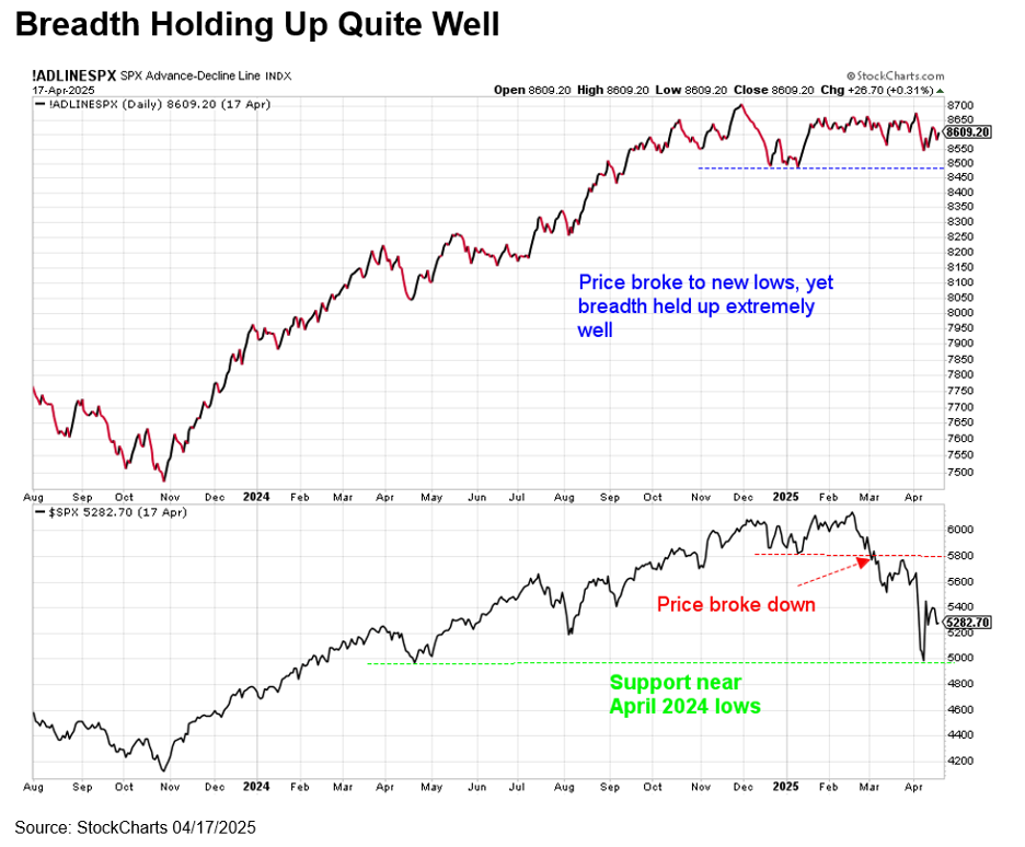 As we noted last week, stocks are trying to carve out a potential low, but risks are clearly still high over the trade war and a Federal Reserve (Fed) in a tough spot. One potential positive is market breadth has held up quite well in the face of the near-bear market. The S&P 500’s advance/decline line is a cumulative tally of how many stocks advance and decline each day and it can give clues under the surface for how things are really doing. As the chart below shows, the S&P 500’s advance/decline line has held up well above the early 2025 lows, whereas price for the S&P 500 has broken beneath those levels, suggesting there is potential strength under the surface. Additionally, the S&P 500 found support just beneath the 5,000 level, which was also the lows last April 2024.