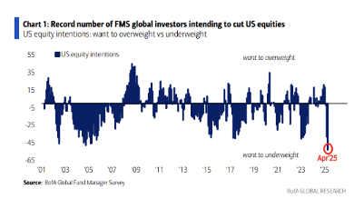 The recently released Bank of America Global Fund Manager Survey showed a record number of participants who intend to cut US exposure, as shown in the chart below. The survey also showed the largest two-month jump in cash since April 2020 and the 4th highest recession expectations ever. Given this survey looks at managers who manage actual portfolios, this is a very solid potential contrarian indicator.