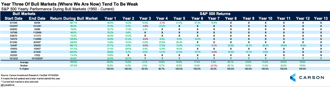 As we noted in our 2025 Outlook: Animal Spirits, stocks usually see huge gains the first two years of a bull market (just like they did this time) and the third year can be more choppy and frustrating. Although we expect stocks to do much better than the average third year gain of 2.1%, this is still something to consider a potential issue. End of the day, after the huge gains we saw two years off of the October 2022 lows, it would be perfectly normal to see some consolidation at some point in 2025.