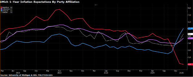 Now one big issue with this survey is that it’s “contaminated” by politics. If you separate 1-year ahead expectations of inflation by party affiliation, this is what it shows:
