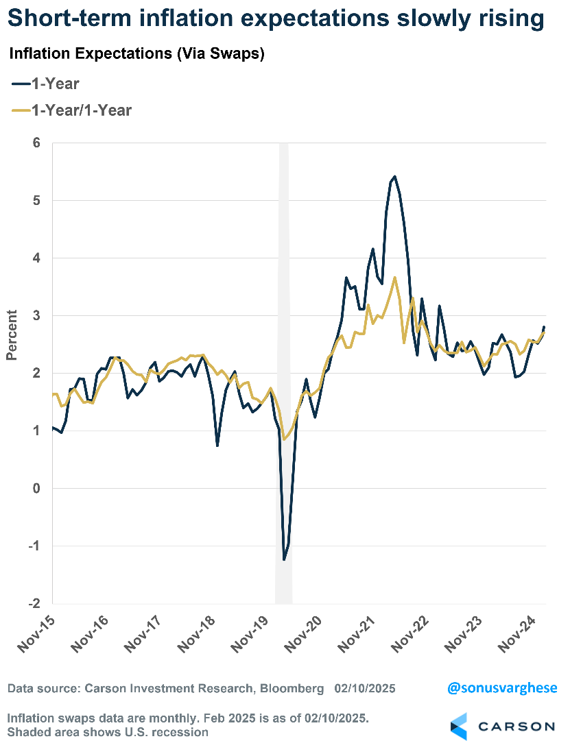 Market-implied short-term inflation expectations have also been rising recently, and markets are generally apolitical. 1-year ahead inflation expectations have moved up to 2.8%, the highest since March 2023. We also calculated 1-year/1-year forward inflation expectations, which is inflation expected in the second year from now (roughly 2026). That’s risen to 2.7%, the highest since November 2022. “Normal” levels, at least going back pre-pandemic levels, were around 2.2 – 2.3%. Again, what’s worrisome here is that these changes are not because of higher energy prices (which have hovered in a fairly tight range recently). Instead, this is likely where the tariff uncertainty is being manifested.  Interestingly, we didn’t see a similar increase in 2018 – 2019 amid the trade war, but this time around markets may be sensitive to the fact that we’re in a generally higher inflation regime.