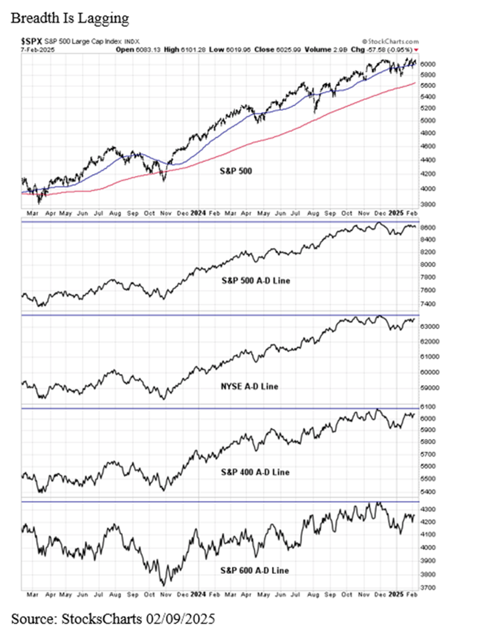 An advance/decline (A/D) line is simply a cumulative tally of how many stocks go up or down each day on a specific exchange. The way many of us learned it, breadth leads price. When A/D lines make new highs, it suggests the indexes will likely continue a bullish phase. We saw A/D lines break down well ahead of the tech bubble bursting 25 years ago and again before the Great Financial Crisis, suggesting there indeed was deterioration under the surface.