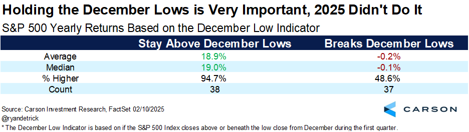 Those 38 times the December lows held? The full year was up an incredible 36 times and up an average of 18.9%. The times it failed? The full year was down 0.2% on average and higher less than a coin flip.