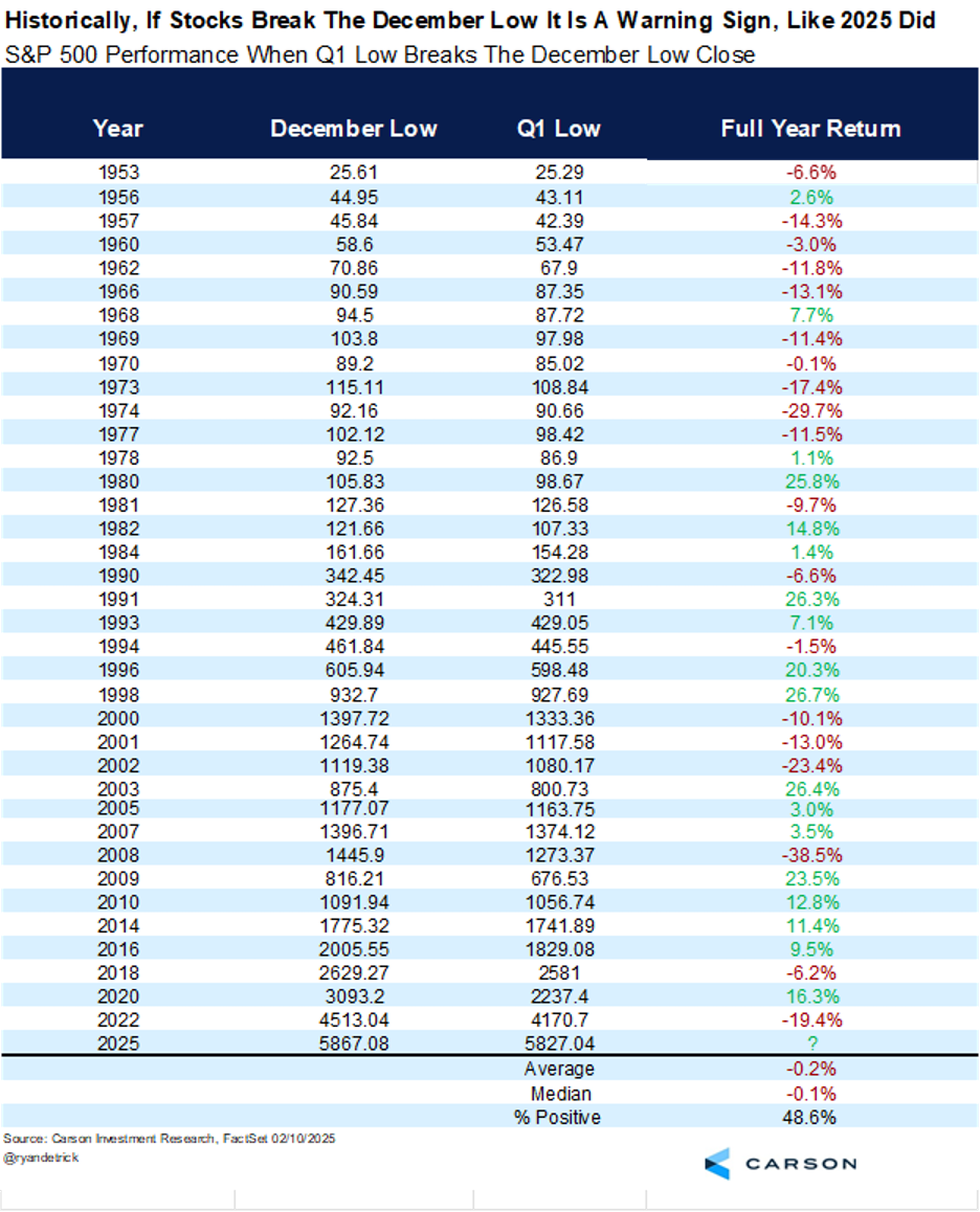 Here’s the other side to things and unfortunately where things stand in 2025. What happened when the December low was violated? Once again, the full year returns were plain and simple much weaker. Just a quick glance and some of the worst years ever saw the December lows broken in Q1. This infamous list includes years like ’73, ’74, the tech bubble, ’08, and ’22. This doesn’t mean 2025 will be like those years. Still, this is one thing that undoubtedly is in our worry column.