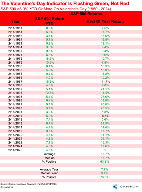 Let’s get to some good news now. Stocks are off to another great start in 2025, and that could be a clue this bull market is alive and well. The S&P 500 is up just under 4% year-to-date as of Valentine’s Day (+3.97%) and it turns out that when stocks are up more than 3% as of this red-themed day, it suggests more green is in the future.