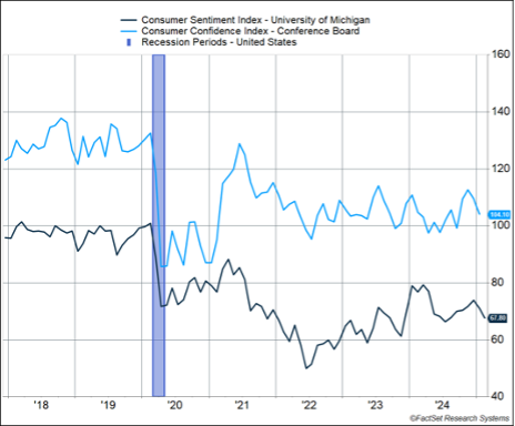 Over the last two years, markets have been able to tune out a pretty dour national mood. Even with all the negative sentiment, the S&P 500 gained more than 25% in both 2023 and 2024. In fact, real GDP growth clocked in at 2.9% annualized over the last two years, above the pre-pandemic trend. Sentiment was downbeat, but this didn’t really crimp consumer spending.