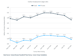 A relatively new tool from the Census Bureau, the Household Pulse Survey, estimates total civilian employment peaked around June 19 and had slid lower in recent weeks. As shown in Figure 2, private employment proved more resilient, but it has dipped in recent weeks, too.