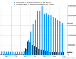 Figure 1 updates the initial and continuing unemployment claims. We’ve shared this chart many times as it provides a weekly update of unemployment trends in the U.S. The dark blue bars chart the number of people filing an initial unemployment claim the previous week. After peaking at around 6.8 million, it gradually slid to 1.3 million. Last week, it rose to 1.4 million and ended the downward trend. Our view is the increased number of coronavirus cases is causing many states to reinstate some social distancing rules. Perhaps even more powerfully, individuals are acting with greater care, and their social distancing actions are pressuring businesses and leading to workers being laid off.