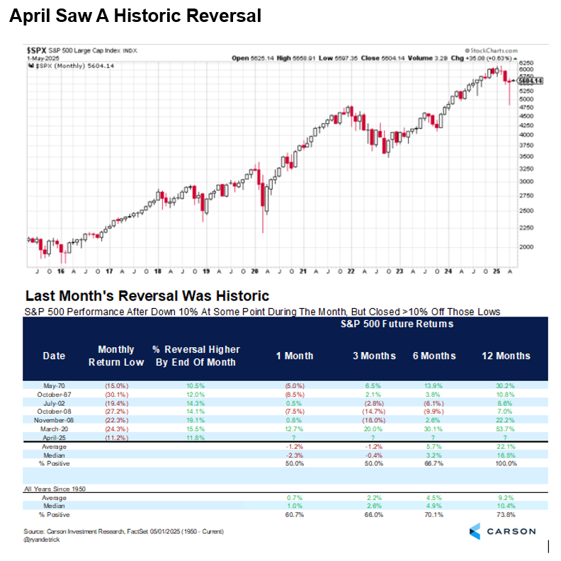We found six other times the S&P 500 was down at least 10% in a month, but finished more than 10% off the monthly low. Potential weakness or choppiness is normal in the near term, but a year later stocks have never been lower, up more than 22% on average. As we discussed last week, there were multiple rare bullish signals and the lows for 2025 are likely in, but this doesn’t mean it will be straight up and some back-and-forth volatility would be perfectly normal.