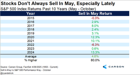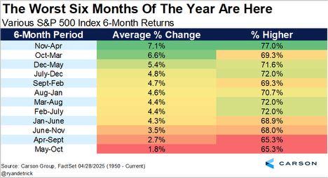 Buckle up, as the trigger points for one of the most well-known investment axioms, “Sell in May and go away,” is here. This gets a ton of play in the media, as the six months starting in May are indeed the worst six consecutive months on the calendar historically. The S&P 500 has averaged only 1.8% over those six months and been higher just over 65% of the time.