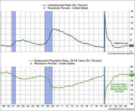 The April jobs report was released on Friday, May 2 and the news was pretty good overall. The economy created 177,000 jobs in April, above expectations for 138,000 jobs. At the same time, this number can be revised quite a lot. (Job creation in February and March were revised down by a combined 58,000.) This is why the 3-month average is more useful, and right now that’s at 155,000. That’s not great, but not too bad either since it’s likely more than enough to keep up with population growth (especially since immigration has fallen). It’s also why the unemployment rate remained unchanged at 4.2%. Slightly more positive is the fact that the prime-age (25-54) employment-population ratio rose to 80.7%, higher than at any point between 2001 and 2019, and not too far below the recent peak of 80.9%.