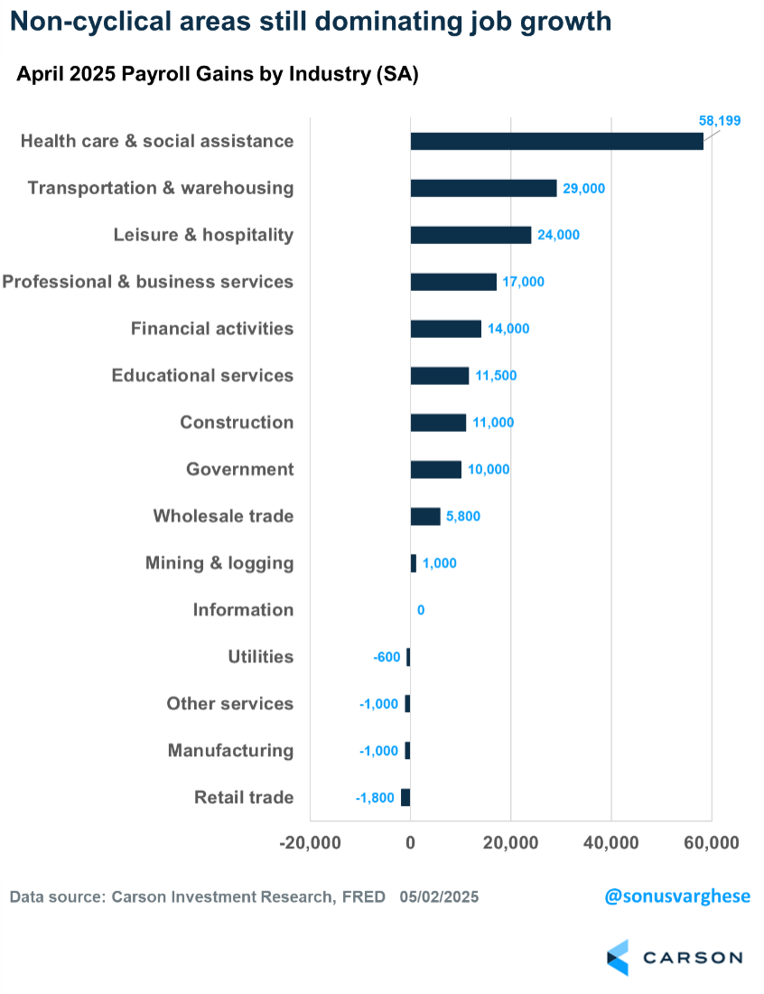 At the same time, the details of the report show that job creation continues to be dominated by the non-cyclical areas of the economy. Healthcare and social assistance, private education, and government created 80,000 of the jobs in April (45%). Cyclical areas like construction, manufacturing, and professional and business services added just 27,000 (15%). This continues the theme of what we’ve seen over the last 6–12 months, with cyclical areas on the weaker side and job creation driven by non-cyclical areas of the economy (greater than 50% over the last six months).